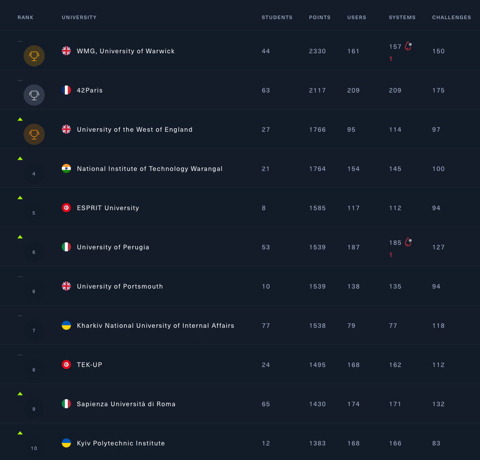 Our vision is to make cybersecurity training accessible to everyone, so we are proud of how global and engaged our community is. We see players signing up from all around the world. For individuals, the strongest territories include the USA, UK, Europe, India, Brazil, and Canada. For corporations, the most prominent markets are the USA, UK, and Europe. The world of academia is represented by over 500 universities from all over the world. Here is a top ten snapshot of the “HTB University Hall of Fame”: