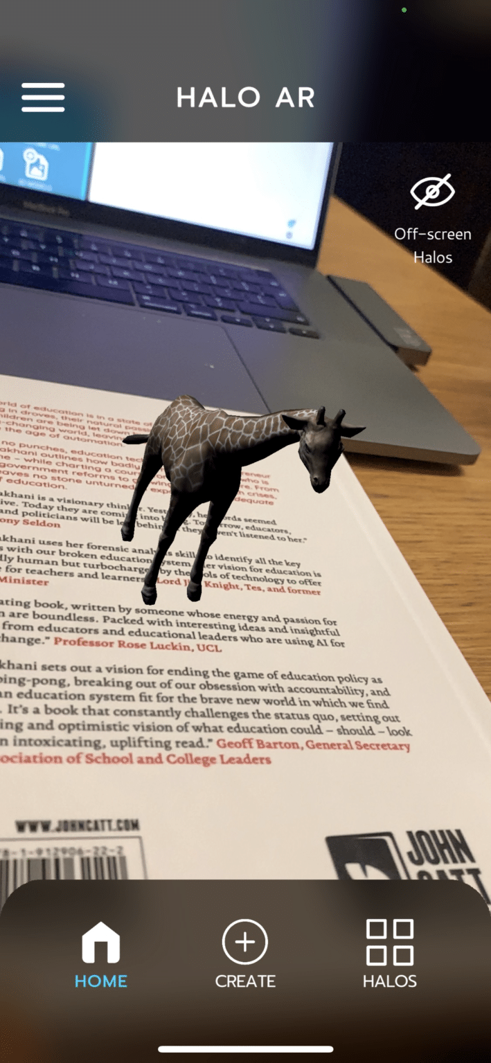 3D Models – at the moment there are only three sample 3D models in the app; the moon; a giraffe (see photo below) and a tree. Clearly not that useful, yet – but as you’ll see from the giraffe photo they are pretty amazing (can’t wait to see developments in this area!)