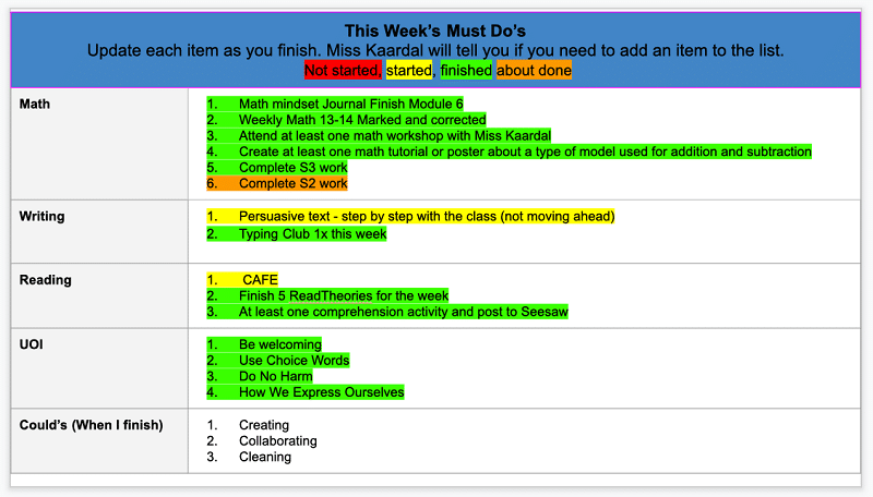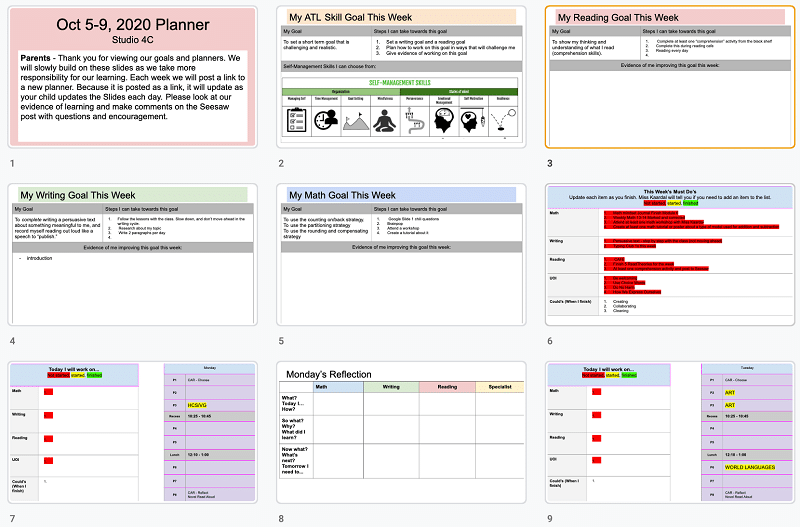 Keep in mind that every class progresses differently. Each group of students that I have worked with have different needs and different preferences when it comes to goal setting and keeping track of their progress throughout the week. Some classes loved using Google Keep, some hated it. The variety of apps within Google for Education makes it possible for students to pick and choose what they want to use. Some classes adapted quickly to this idea of planning for themselves, and others take longer. It is important to react to the class you have in front of you, and work alongside them towards their own goals. If you would like to see my progress and iterations of student planners for students in grades 3 and 4, you can check out a folder of resources here. Please feel free to make a copy and adapt for your students’ needs.