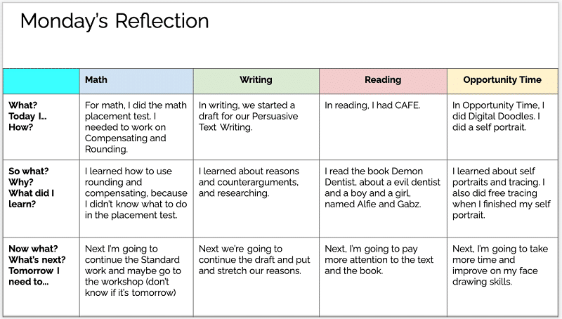 Setting short term and long term goals are important. On Monday morning set aside a chunk of time for students to work on creating (or adding to) these goals. If you can, also provide time at the end of each day to update these goals, provide evidence, reflect, and think about their next steps. Next week they might have the same goal and that’s okay! It shows that not all goals need to be 100% complete in 5 days. That’s real!