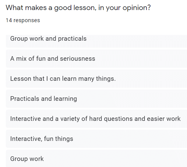 2. Google Forms. This tool has been part of my normal way of working for several years. At the beginning of the term, I give all students a “getting to know each other” survey; after each test, a Reflection; at the end of the academic year, a survey to Feedback the teacher. Setting up the form to collect email addresses means I can then export results in the tracking spreadsheet and identify students’ needs and preferences. As part of the initial survey, I asked them “What do you want Mx Astolfi to know about you?” – something as simple as that revealed insightful information about my new students which I can then use to build better learning environments. Since the students are given the forms as part of lessons or as homework, they become used to verbalise their thoughts – which fosters better communication overall. [snipped below from initial student survey]
