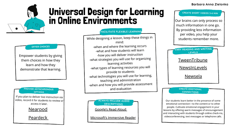 Let’s start with Universal Design for Learning (UDL) which is an educational framework to improve and optimize teaching and learning for everyone and is based on scientific insights into how humans learn. Every time I design a lesson, I start with UDL. Not only is it useful in a traditional classroom, but it is also extremely important in online environments. Mike Marotta says: “It is a way to connect every student to the learning experience, and a way at looking at learning that is fully inclusive and promotes success for all learners, regardless of ability.“
